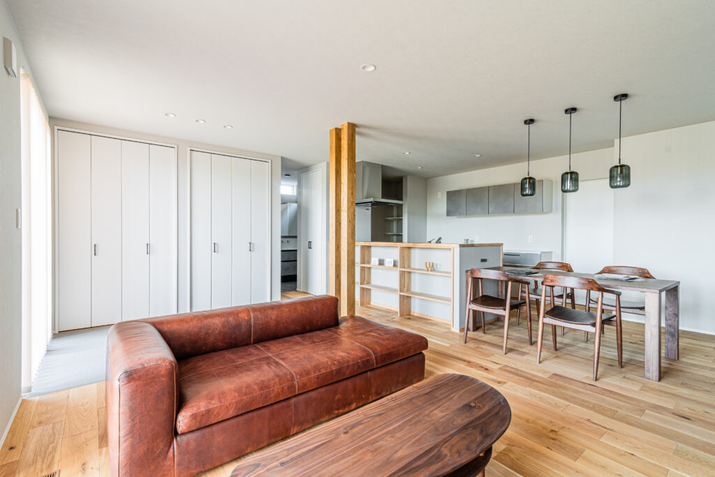 こちらのコーディネートは内装はオークと白を基調としたお家ですが、アクセントとしてインテリアはダークブラウンのレザーソファや、ウォールナットのダイニングテーブルとチェアでコーディネートしています。