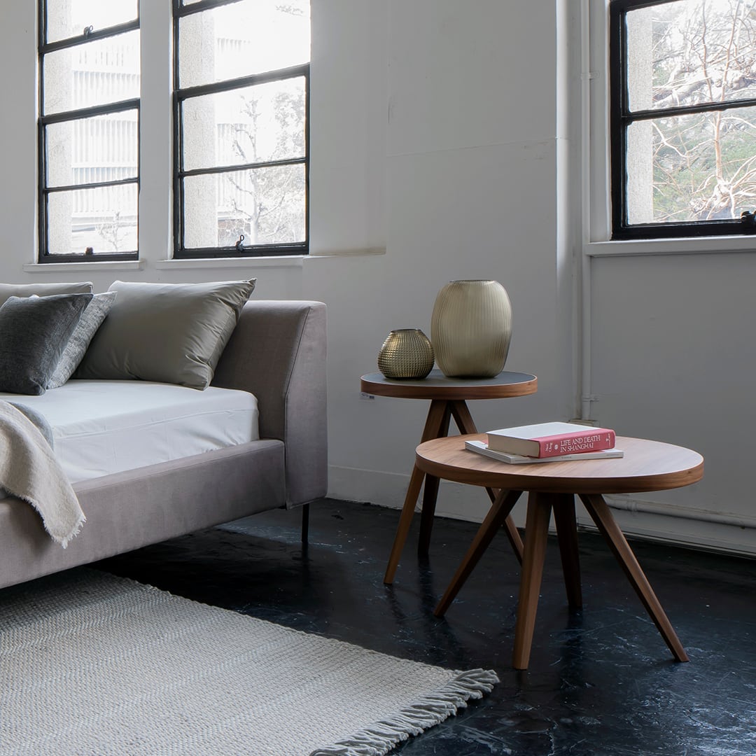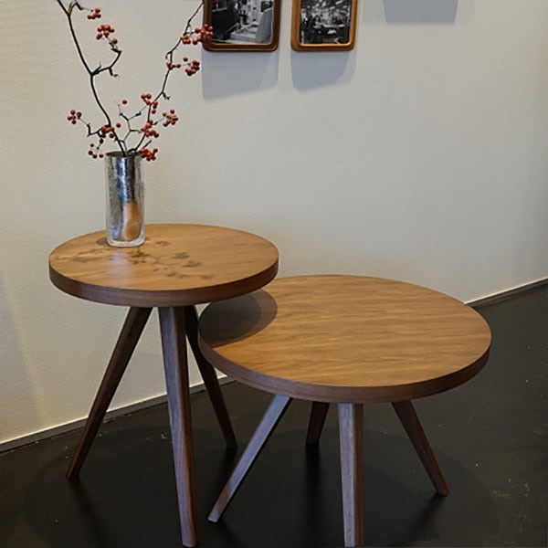 支柱が中央から斜めに支える形が特徴的なデザインのアイシーシリーズ。直径と高さをそれぞれ3種類ご用意。使い易い位置に自由な設計でチョイスいただけます。